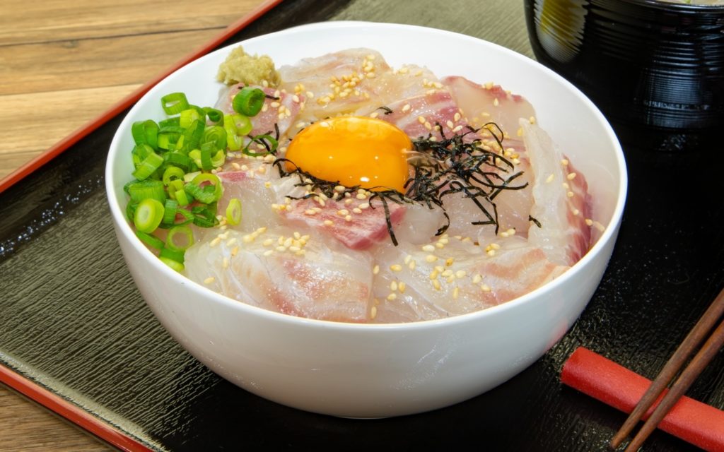 鯛の刺身をご飯にのせ、卵と特製のたれで食べる